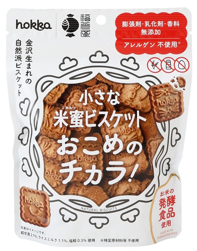 膨張剤・乳化剤・香料無添加、アレルゲン不使用の「米蜜ビスケット」です。 家族や友達、みんなで食べられるお菓子です。 金沢の老舗酒蔵「福光屋」の糀甘酒・発酵ライスミルク・塩糀を使用し、 お米の発酵食品などから生まれるおだやかなコクと甘み、 玄米の香ばしさとやわらかな口溶けをお楽しみいただけます。